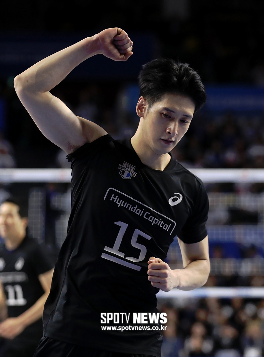 [스포티비뉴스=천안, 한희재 기자] 현대캐피탈과 대한항공의 2018-2019 도드람 V리그 챔피언 결정전 3차전이 26일 오후 충남 천안 유관순체육관에서 열렸다. 득점을 올린 현대캐피탈 문성민이 기뻐하고 있다.