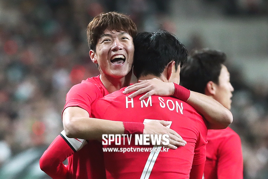 [스포티비뉴스=서울, 곽혜미 기자] 대한민국 축구대표팀과 콜롬비아 대표팀의 평가전이 26일 오후 서울월드컵경기장에서 열렸다. 손흥민이 선제골을 성공시키고 황의조와 포옹을 하고 있다.