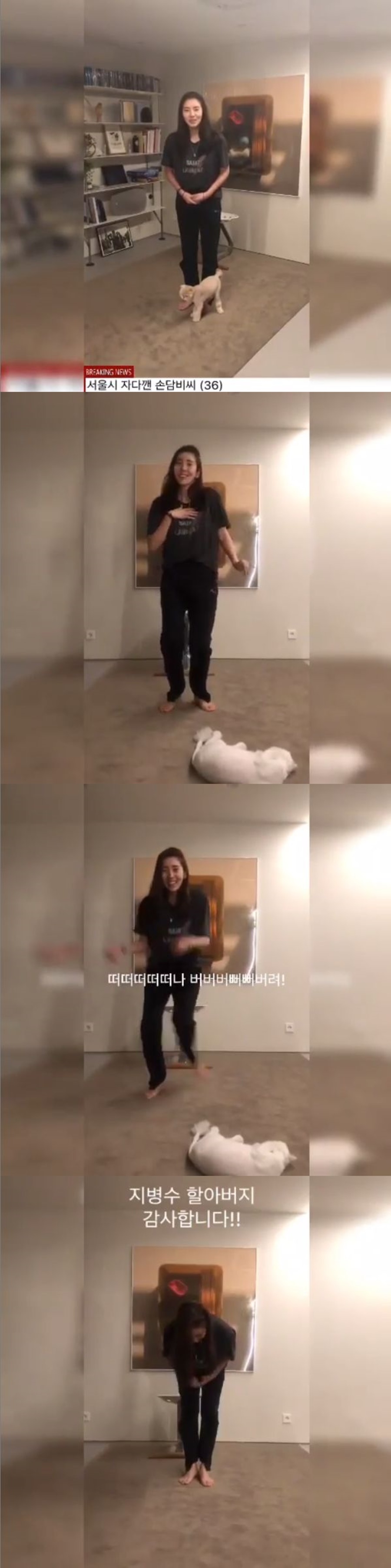 손담비는 26일 자신의 인스타그램에 "종로구 지병수 할아버님의 열정에 반해 너무 감사한 마음에 저도 답춤을 췄습니다. 할아버지! 건강히 오래 사세요"라는 글과 1분 가량의 영상을 올렸다.