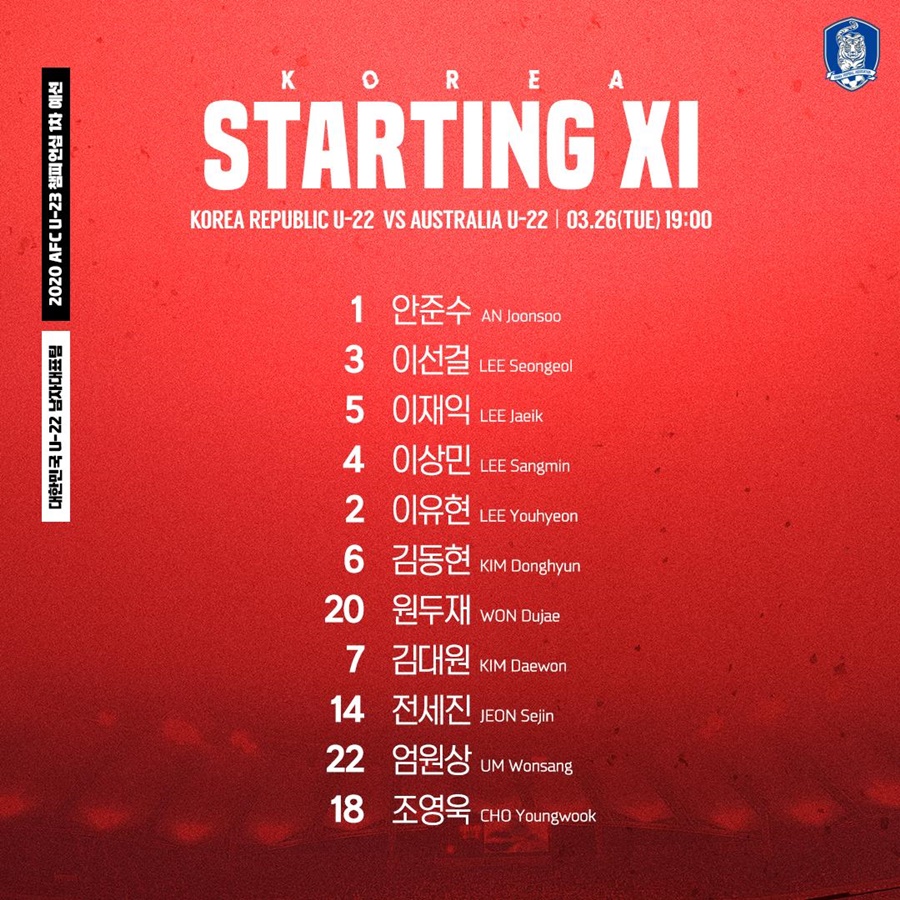 한국은 조영욱, 엄원상, 전세진, 김대원으로 공격수 네 명을 투입했고, 원두재, 김동현, 이유현, 이상민, 이재익, 이선걸, 안준수가 선발 출전했다.