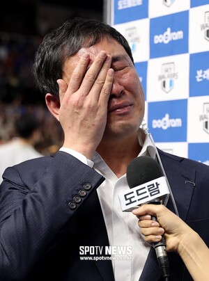 [스포티비뉴스=천안, 한희재 기자] 현대캐피탈이 대한항공을 꺾고 26일 충남 천안 유관순체육관에서 열린 2018-2019 도드람 V리그 챔피언에 올랐다. 챔피언에 오른 최태웅 감독이 인터뷰중 눈물을 흘리고 있다.