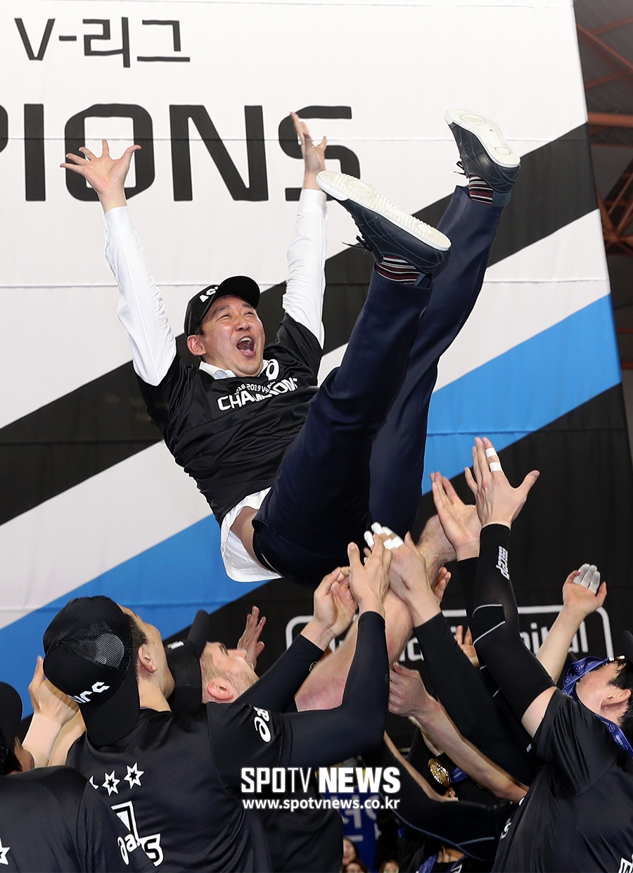 [스포티비뉴스=천안, 한희재 기자] 현대캐피탈이 대한항공을 꺾고 26일 충남 천안 유관순체육관에서 열린 2018-2019 도드람 V리그 챔피언에 올랐다. 현대캐피탈 최태웅 감독이 헹가래를 받고 있다.