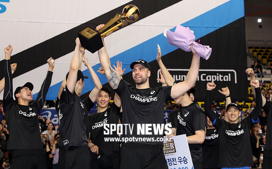 [스포티비뉴스=천안, 한희재 기자] 현대캐피탈이 대한항공을 꺾고 26일 충남 천안 유관순체육관에서 열린 2018-2019 도드람 V리그 챔피언에 올랐다. 파다르가 우승 트로피를 들어 올리고 있다.