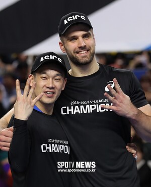 [스포티비뉴스=천안, 한희재 기자] 현대캐피탈이 대한항공을 꺾고 26일 충남 천안 유관순체육관에서 열린 2018-2019 도드람 V리그 챔피언에 올랐다. 여오현과 파다르가 취재진을 향해 포즈를 취하고 있다.