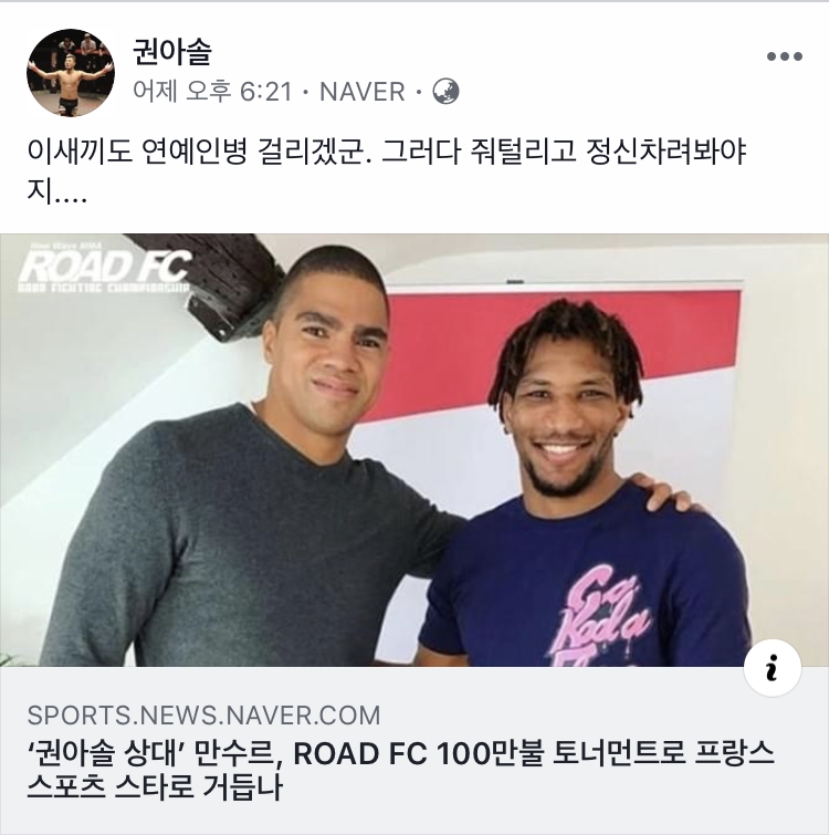 권아솔은 26일 페이스북에 "이 녀석도 연예인병 걸리겠군. 그러다 엄청 맞고 정신 차려 봐야지”라고 적었다.