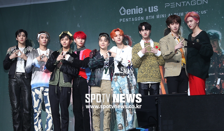 [스포티비뉴스=서울, 곽혜미 기자] 보이그룹 펜타곤 미니 8집 'Genie:us' 발매 기념 쇼케이스가 27일 오후 서울 용산구 한남동 블루스퀘어에서 열렸다. 펜타곤이 포즈를 취하고 있다.