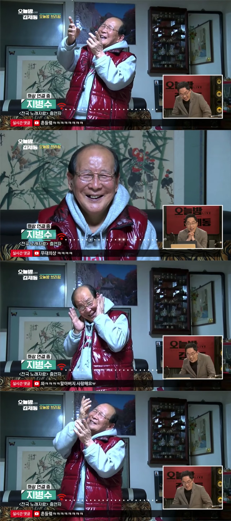 이날 '오늘밤 김제동'은 화제의 주인공 '미쳤어 할아버지' 지병수 씨와 화상통화를 연결해 이야기를 나눴다. 김제동은 지병수 할아버지가 평소 즐겨 부르는 노래를 한 곡 청했다.