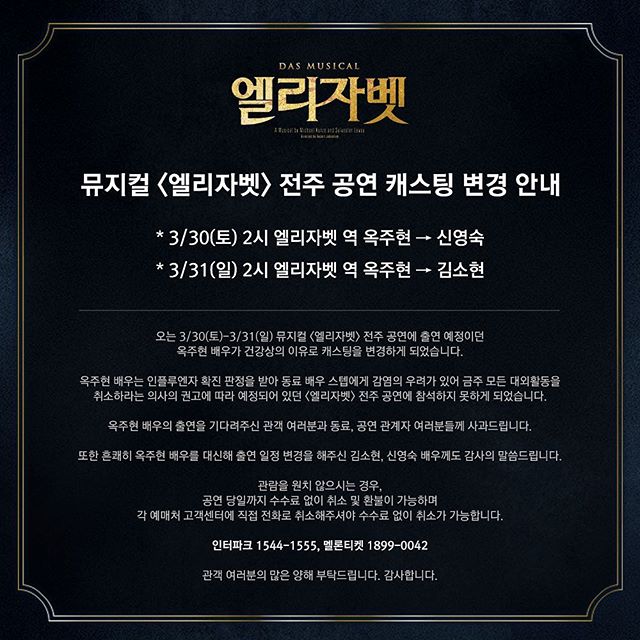 뮤지컬 '엘리자벳' 제작사 EMK뮤지컬컴퍼니는 27일 "오는 30일과 31일 뮤지컬 '엘리자벳' 전주 공연에 출연 예정이던 옥주현 배우가 건강상의 이유로 캐스팅을 변경하게 됐다"고 밝혔다.