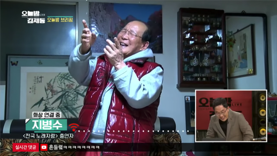 지병수 할아버지는 26일 KBS1 '오늘밤 김제동'에도 출연해 또 다른 화제 영상을 탄생시켰다. 할아버지는 이날 생방송에서 채연의 '흔들려'를 무반주로 선보였다.