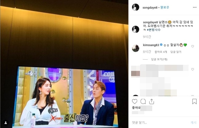 이에 송다예도 27일 자신의 인스타그램에 "남편, 아직 감 있네 있어"라며 "도마뱀 사기꾼 취저(취향저격)"라는 글과 '라디오스타' 방송 중인 TV를 촬영한 사진을 올려 남편이 출연한 ‘라디오스타’ 본방 사수를 인증했다. 해당 게시물에 김상혁도 "잘살자"라고 댓글을 달면서 애정을 드러내 많은 이들의 부러움을 샀다.