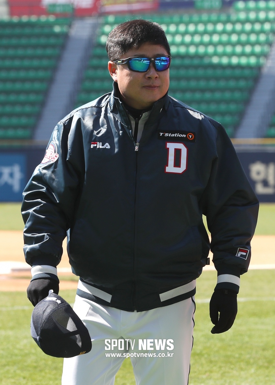 [스포티비뉴스=잠실, 곽혜미 기자] 2019 신한은행 MY CAR KBO리그 두산 베어스와 한화 이글스의 경기가 24일 오후 서울 잠실야구장에서 열린다. 두산 김태형 감독이 그라운드로 나서고 있다.