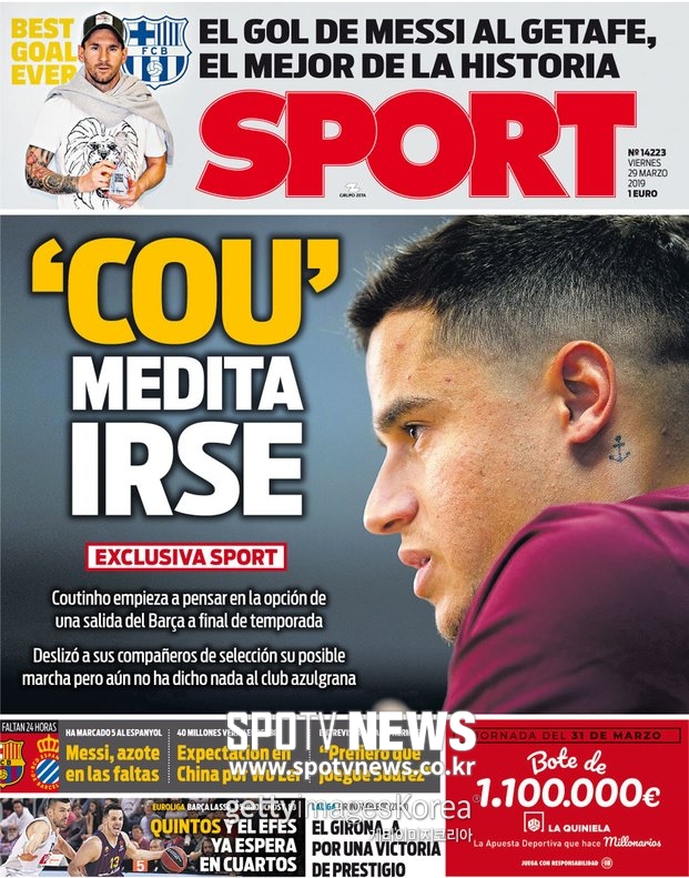 스페인 언론 ‘스포르트’는 29일(한국시간) 지면판을 통해 “쿠치뉴가 올여름에 바르셀로나와 결별을 결정했다고 확신한다. 쿠치뉴는 바르셀로나에서 충분한 출전 시간을 보장 받지 못했고, 벤치에 앉기도 했다”며 여름에 바르셀로나를 떠날 거라 보도했다.