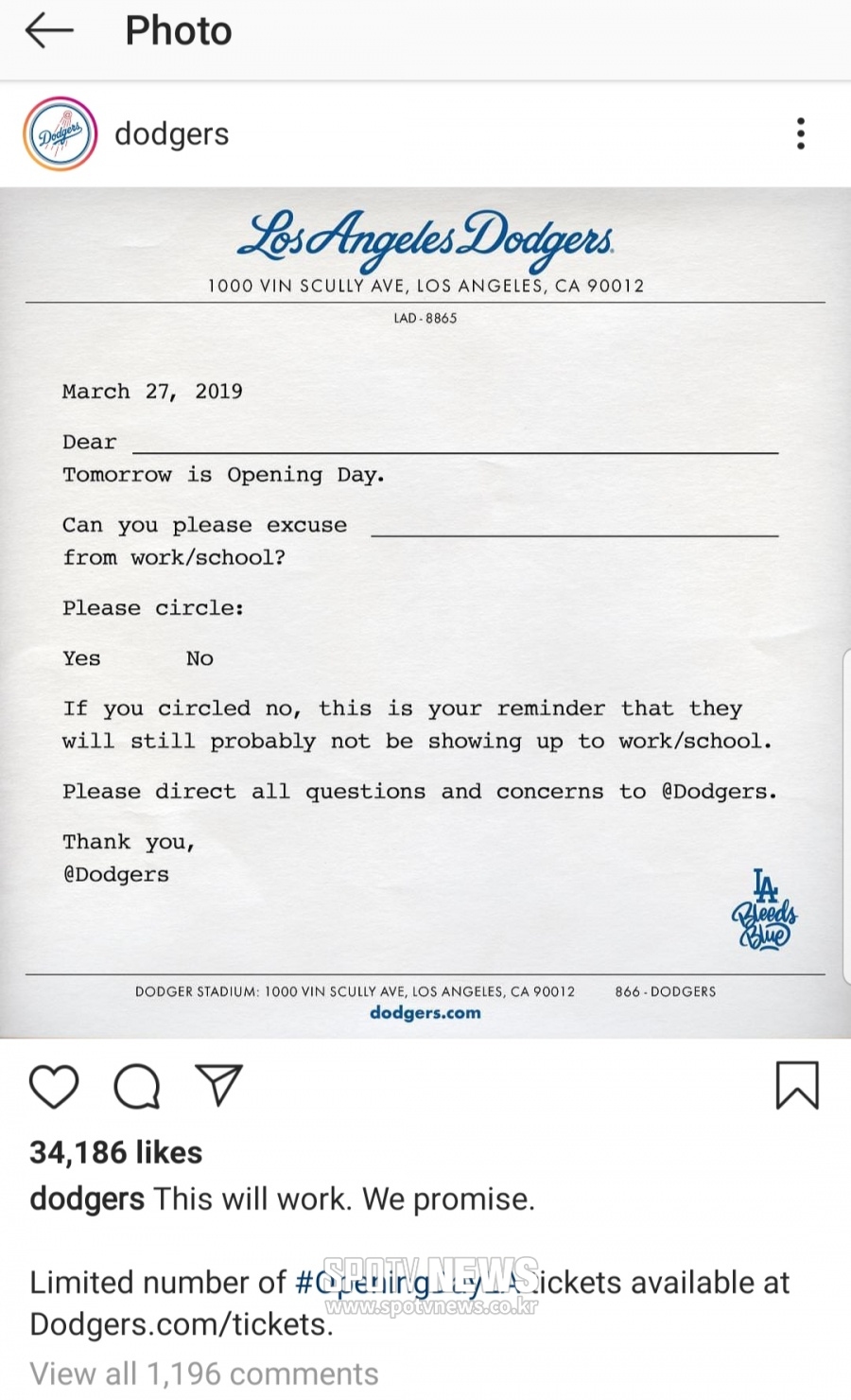 [스포티비뉴스=로스앤젤레스(미 캘리포니아주), 양지웅 통신원] 29일 (한국시간) 2019시즌 개막전이 열린 다저스타디움에는 5만3086명의 야구팬들이 경기를 관람했다.