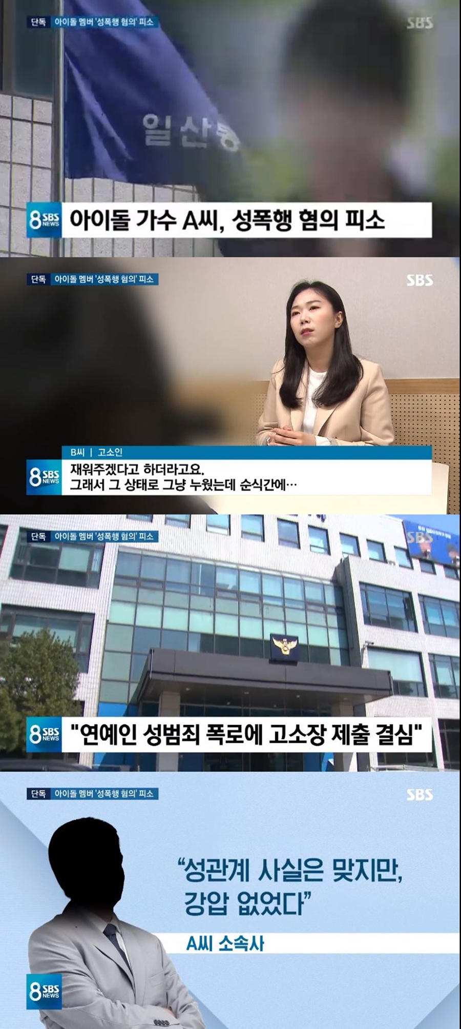29일 SBS '8뉴스'는 유명 아이돌 그룹 멤버가 성폭행 혐의로 피소됐다고 보도했다. 고소인 A씨는 2010년 5월 자신의 집에서 유명 아이돌 그룹 멤버에게 성폭행을 당했다면서 지난 25일 고소장을 제출했다.