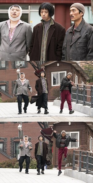 공개된 사진 속 세 사람은 범죄자 느낌이 물씬 풍기는 비주얼로 서 있다. 얼굴에 하얀 붕대를 감은 오요한은 얼굴에 점까지 찍으며 나쁜 놈으로 완벽 분장했다. 태국 건달로 변신한 쏭삭 역시 예사롭지 않은 포스를 발산한다. 한성규 신부의 변신은 파격 그 자체다. 소년 같은 모습은 온데간데없이, 영화 '신세계' 속 '연변 거지' 캐릭터를 연상케 하는 거친 모습으로 시선을 사로잡는다.
