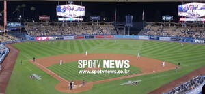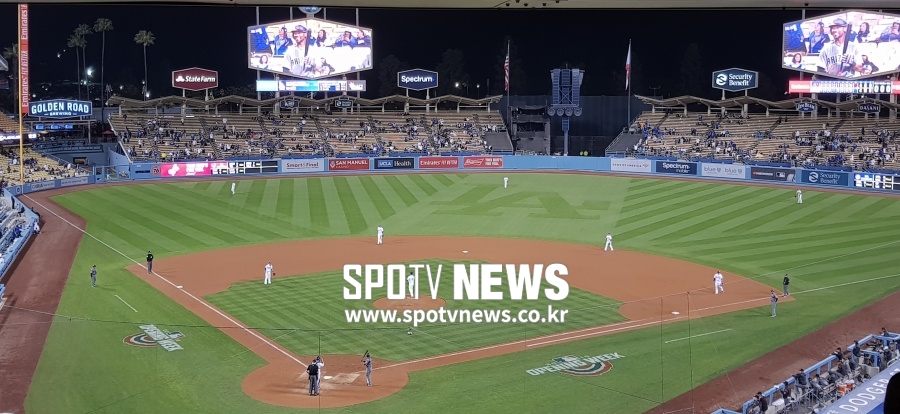 LA 다저스와 애리조나 다이아몬드백스가 30일(한국 시간) 미국 캘리포니아주 로스앤젤레스 다저 스타디움에서 시즌 두 번째 경기에서 연장 혈투를 벌이고 있다.