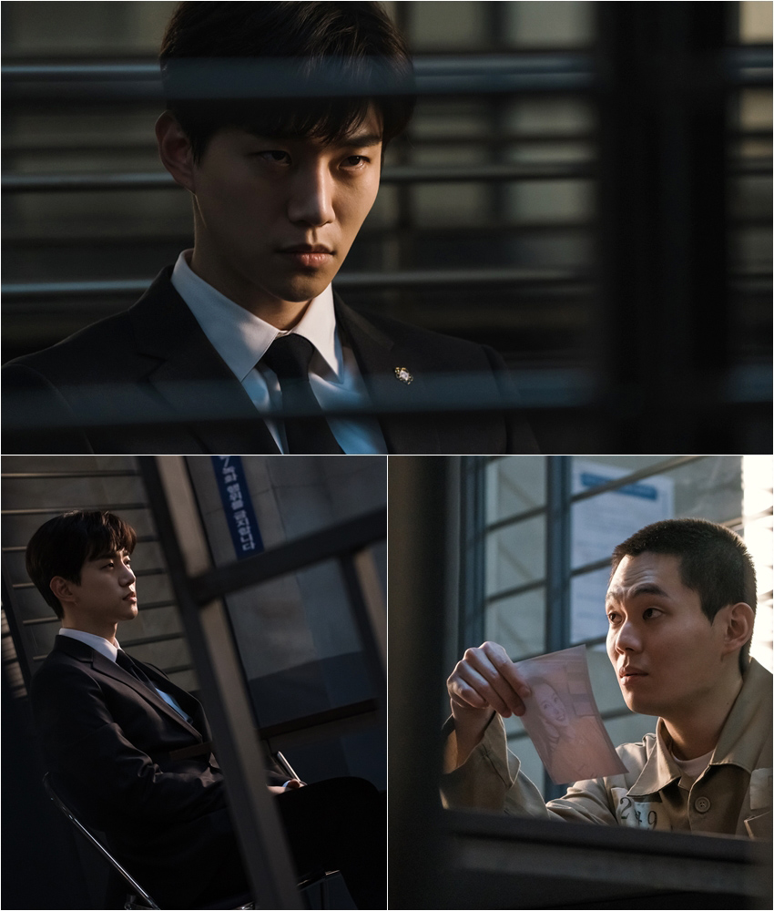 이 가운데 공개된 스틸 속에는 이준호와 류경수가 접견실 안에서 독대하고 있는 모습이 담겨있다. 겉보기엔 영락없는 변호사와 의뢰인의 모습이지만 둘 사이에 흐르는 팽팽한 신경전이 접견실을 흡사 취조실 한복판처럼 만든다.