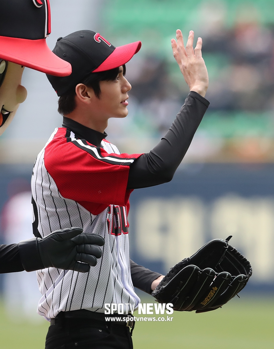 [스포티비뉴스=잠실, 한희재 기자] LG 트윈스와 롯데 자이언츠의 2019 KBO리그 경기가 31일 오후 서울 잠실야구장에서 열렸다. 가수 옹성우가 시구를 마친 후 팬들에게 인사하고 있다.