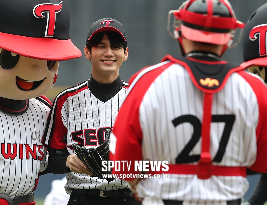 [스포티비뉴스=잠실, 한희재 기자] LG 트윈스와 롯데 자이언츠의 2019 KBO리그 경기가 31일 오후 서울 잠실야구장에서 열렸다. 가수 옹성우가 시루를 마친 후 LG 포수 유강남과 인사하고 있다.