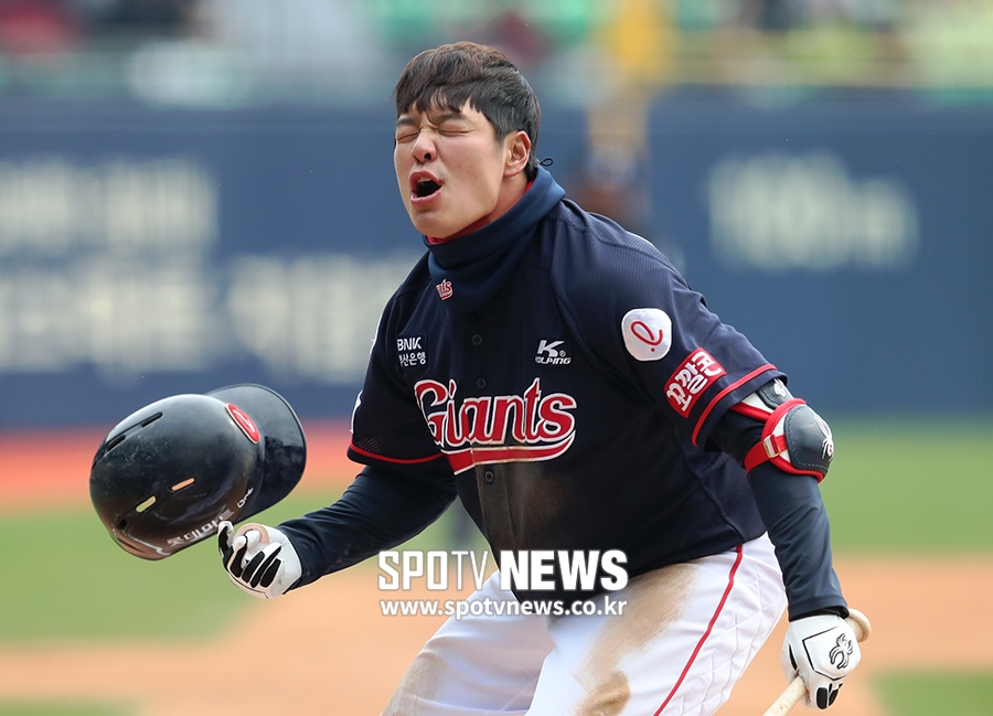 [스포티비뉴스=잠실, 한희재 기자] LG 트윈스와 롯데 자이언츠의 2019 KBO리그 경기가 31일 오후 서울 잠실야구장에서 열렸다. 2회초 2사 2루, 롯데 민병헌이 헛스윙 삼진을 당하며 아쉬워하고 있다.