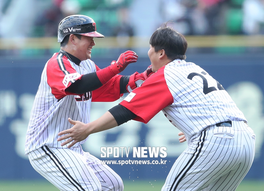 [스포티비뉴스=잠실, 한희재 기자] LG 트윈스와 롯데 자이언츠의 2019 KBO리그 경기가 31일 오후 서울 잠실야구장에서 열렸다. LG 유강남이 연장 10회말 1사 1, 2루, 끝내기 2루타를 친 후 김현수와 포옹을 하고 있다.