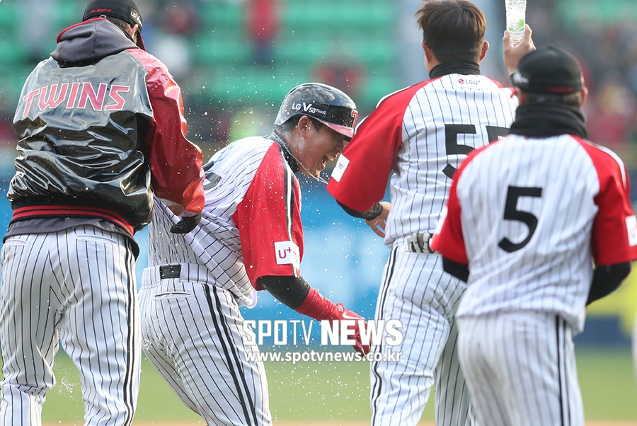 [스포티비뉴스=잠실, 한희재 기자] LG 트윈스와 롯데 자이언츠의 2019 KBO리그 경기가 31일 오후 서울 잠실야구장에서 열렸다. LG 유강남이 연장 10회말 1사 1, 2루, 끝내기 2루타를 친 후 동료들의 축하를 받고 있다.