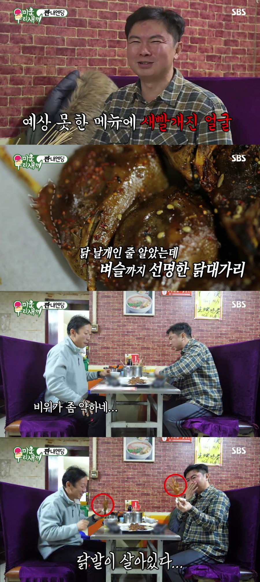 최고의 1분은 '닭발 꼬치'에서 터졌다. 이들이 몸짓을 동원하며 계속 '닭날개 꼬치'를 주문했으나 두 번 연속 '닭발 꼬치'가 나오는 바람에 보는 이들을 웃음바다로 만들었다. 특히 닭발에 발톱이 그대로 세워져있자 임원희는 먹기를 주저하며 쉽지 않은 식사를 이어가 웃음을 자아냈다.