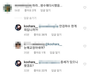 또 다른 누리꾼이 “눈 안 했을 때가 더 예쁘다”고 덧붙이자 구하라는 "증세가 있으니 했겠죠"라며 쌍커풀 수술 의혹에 댓글을 남겼다. 또한 "눈 안 했을때가 더 예쁜데"라는 글에는 "그렇게 봐주시면 고맙겠다"고 답했다.