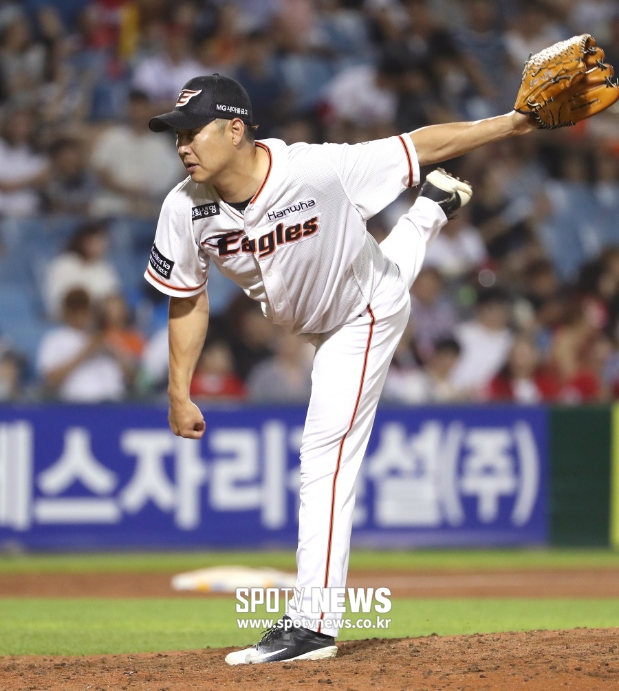 [스포티비뉴스=잠실, 곽혜미 기자] '2018 신한은행 마이카 KBO 리그' 두산 베어스와 한화 이글스의 경기가 8일 오후 서울 잠실야구장에서 열렸다. 7회말 한화 송은범이 역투하고 있다.
