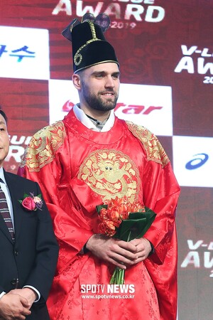 [스포티비뉴스=서울, 곽혜미 기자] 2018-2019 V리그 시상식이 1일 오후 서울 서초구 양재동 더케이호텔에서 열렸다. 베스트 드레서상을 수상한 현대캐피탈 파다르가 기념 촬영을 하고 있다.