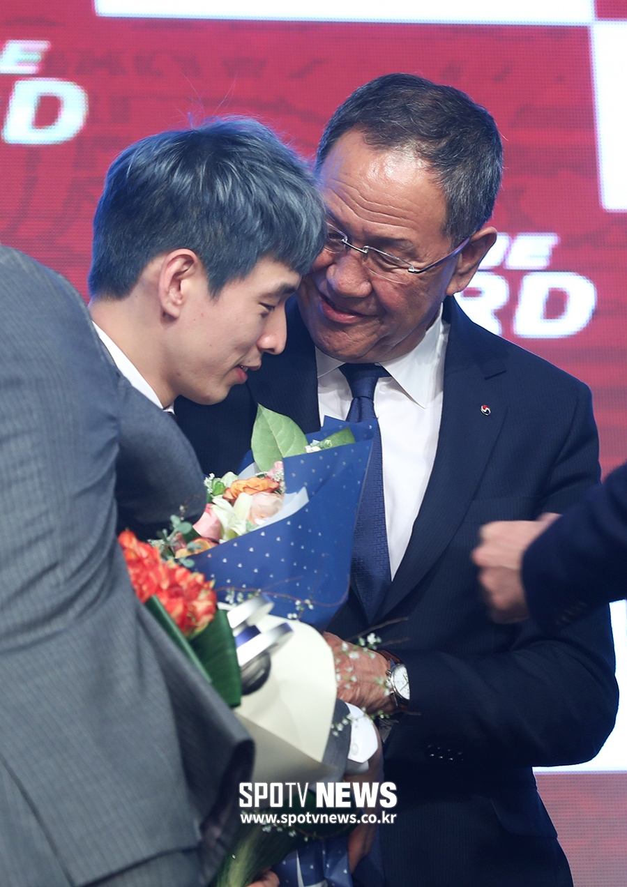 [스포티비뉴스=서울, 곽혜미 기자] 2018-2019 V리그 시상식이 1일 오후 서울 서초구 양재동 더케이호텔에서 열렸다. 베스트7 세터 부문에 선정된 대한항공 한선수를 박기원 감독이 축하하고 있다.