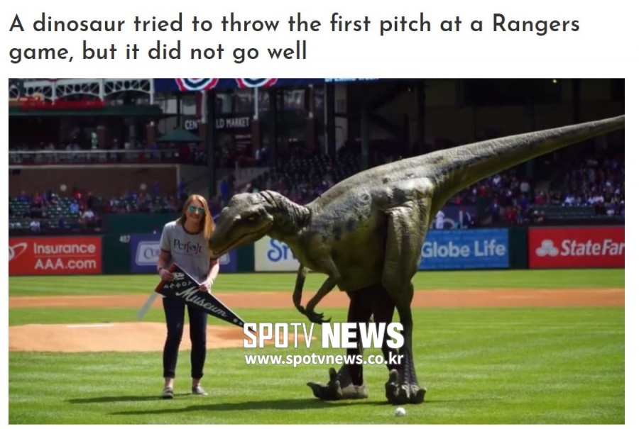 1일(한국 시간) 텍사스 레인저스는 글로브라이프파크에서 열린 시카고 컵스와 경기에 앞서 '공룡의 날' 행사를 가졌다. 행사 분위기에 맞춰 선정한 시구자는 댈러스 페로 자연과학박물관의 록시라는 공룡. 록시는 공을 물고 몸을 이용해 시구를 하려고 했으나….