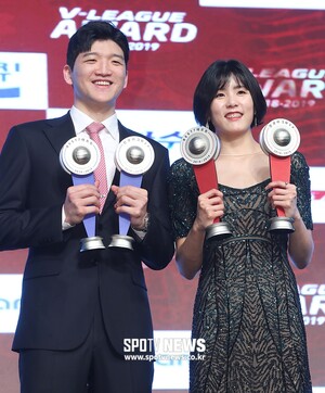 [스포티비뉴스=서울, 곽혜미 기자] 2018-2019 V리그 시상식이 1일 오후 서울 서초구 양재동 더케이호텔에서 열렸다. MVP 대한항공 정지석과 흥국생명 이재영이 기념 촬영을 하고 있다.