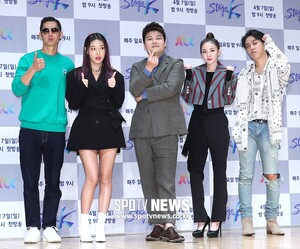[스포티비뉴스=서울, 곽혜미 기자] JTBC 글로벌 K팝 챌린지 ‘스테이지K’ 제작 발표회가 2일 오후 서울 마포구 상암동 JTBC홀에서 열렸다. 박준형, 유빈, 전현무, 산다라박, 은지원(왼쪽부터)이 포즈를 취하고 있다.