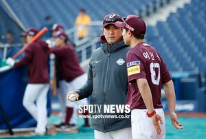 [스포티비뉴스=창원, 한희재 기자] NC 다이노스와 키움 히어로즈의 2019 신한은행 MY CAR KBO리그 경기가 2일 오후 창원NC파크에서 열린다. 키움 장정석 감독이 트레이닝 코치와 이야기를 하고 있다.