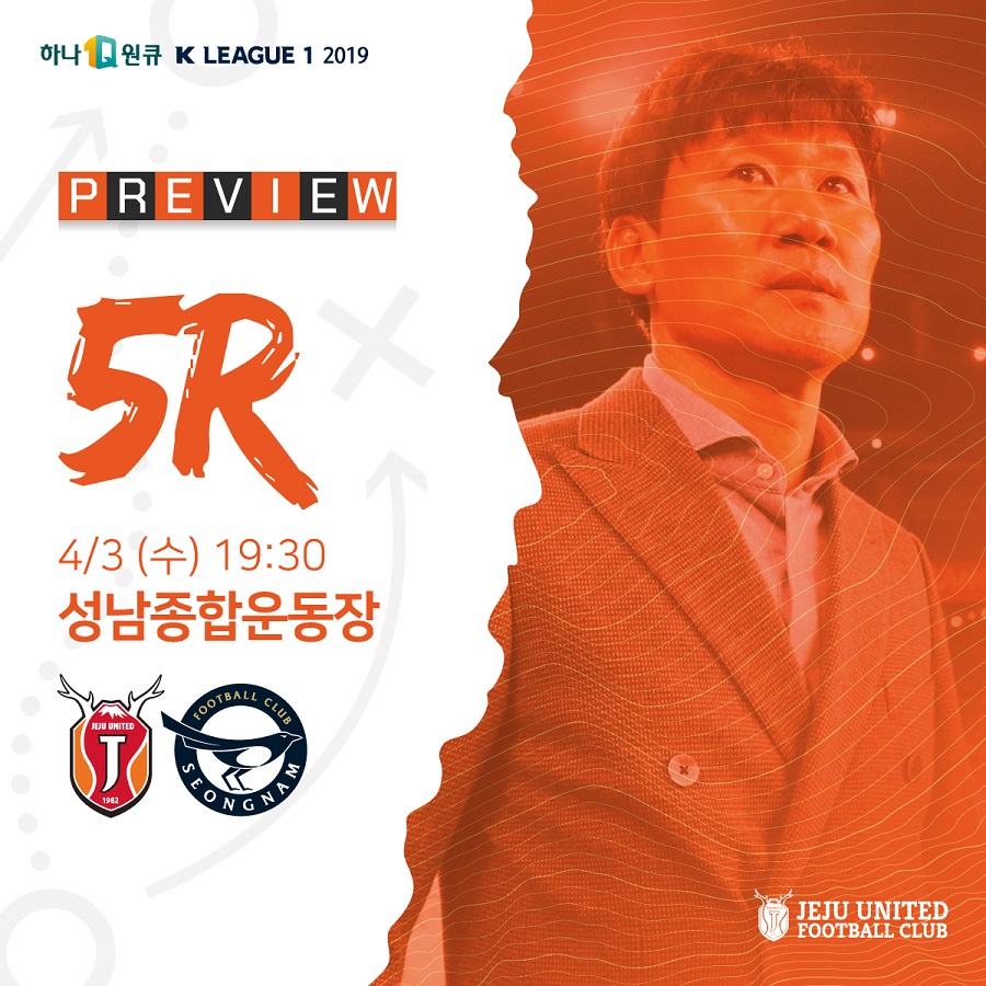 제주는 3일 오후 7시 30분 성남종합운동장에서 성남과 하나원큐 K리그1 5라운드 원정 경기를 치른다. 앞서 리그 4경기에서 2무 2패에 그친 제주는 성남을 상대로 첫승을 노린다. 성남은 3라운드 수원삼성전 2-1 깜짝 승리를 거뒀으나, 4라운드 강원 FC와 경기에서 1-2로 지며 상승세를 이어 가지 못했다.
