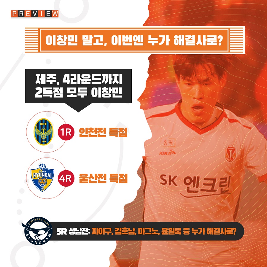 4경기에서 득점이 부족한 제주는 4경기 연속 실점(6실점)한 성남의 골문을 타깃으로 삼는다. 포백과 스리백을 혼용하는 성남은 안영규-임채민-연제운으로 이루어진 수비 라인의 안정성이 부족하다는 평가. 지난 강원전에서도 2골 모두 수비 굴절 및 실수로 내줬다.