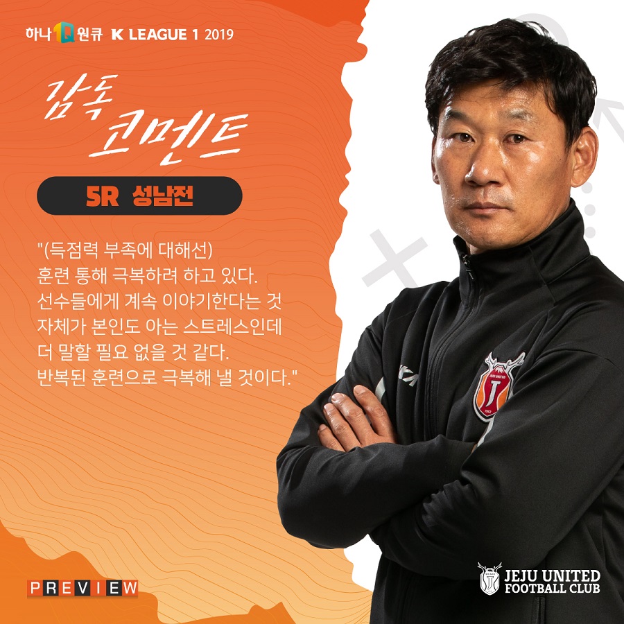 조성환 제주 감독은 지난 울산 현대전 이후 득점력이 부족하다는 평가에 대해 "훈련을 통해 극복하려 하고 있다. 선수들에게 계속 이야기한다는 것 자체가 본인도 아는 스트레스인데 더 말할 필요가 없을 것 같다. 반복된 훈련으로 극복해 낼 것"이라고 평가했다.