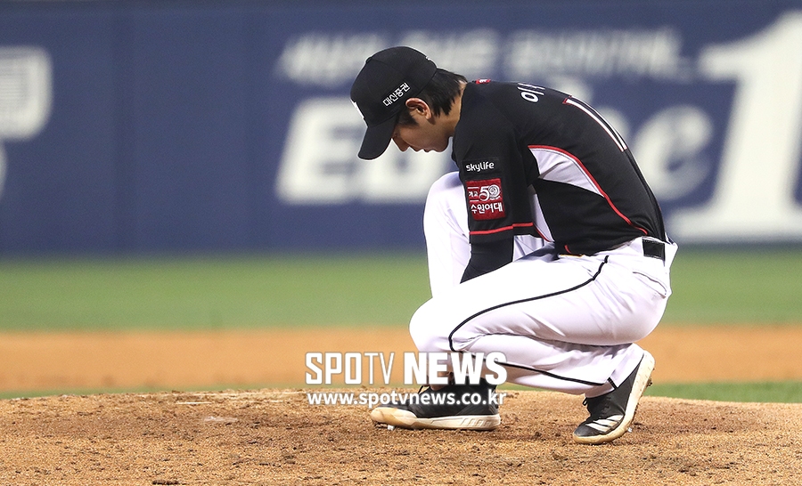[스포티비뉴스=잠실, 곽혜미 기자] 2019 신한은행 MY CAR KBO리그 두산 베어스와 KT 위즈의 경기가 2일 오후 서울 잠실야구장에서 열렸다. 1회말 1사 1,3루 상황에서 두산 허경민에게 1타점 적시타를 허용한 KT 이대은이 신발끈을 고쳐 묶고 있다.