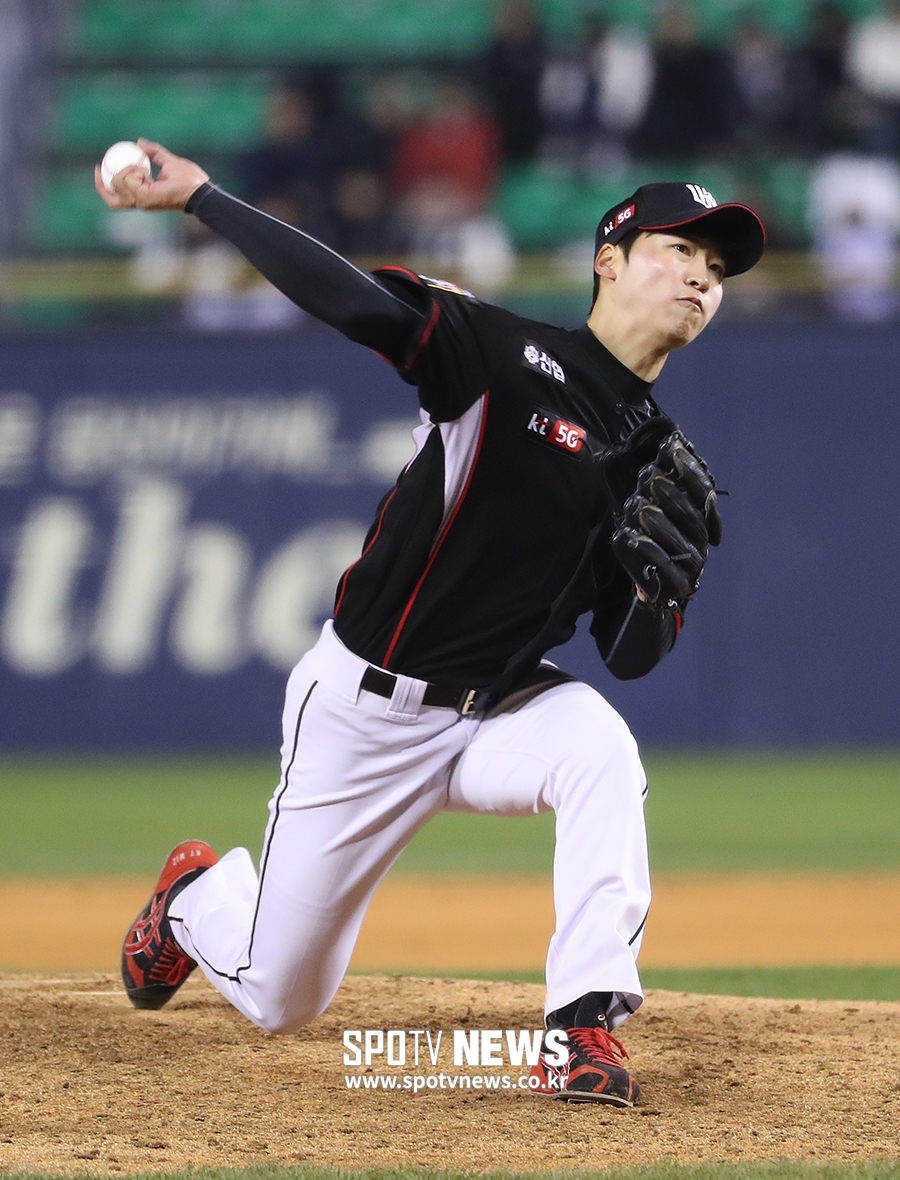 [스포티비뉴스=잠실, 곽혜미 기자] 2019 신한은행 MY CAR KBO리그 두산 베어스와 KT 위즈의 경기가 2일 오후 서울 잠실야구장에서 열렸다. 6회말 KT 엄상백이 역투하고 있다.
