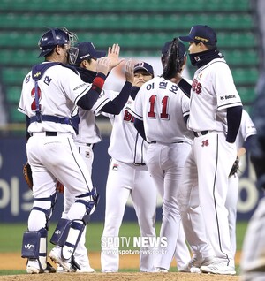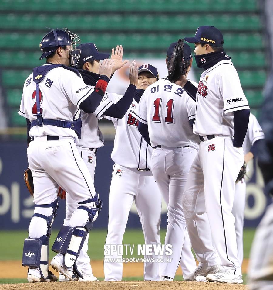[스포티비뉴스=잠실, 곽혜미 기자] 2019 신한은행 MY CAR KBO리그 두산 베어스와 KT 위즈의 경기가 2일 오후 서울 잠실야구장에서 열렸다. 9-0으로 승리한 두산 선수들이 승리의 기쁨을 나누고 있다.