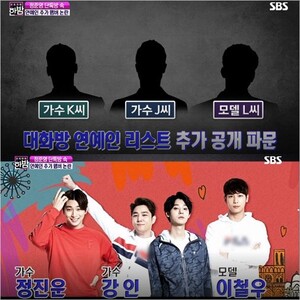 지난달 28일 MBC ‘뉴스데스크’는’정준영 단톡방’ 새멤버와 그 대화 내용을 보도했다. ‘뉴스데스크’는 ‘단톡방’ 멤버로 이미 알려진 빅뱅 전 멤버 승리, FT아일랜드 전 멤버 최종훈, 하이라이트 전 멤버 용준형 외에 가수 K 씨와 J 씨 2명과 모델 L 씨 등이 단체 대화방 멤버로 포함되어 있었다. 이를 두고 온라인에서는 단체 대화방 대화 시기 등을 조합해 ‘K 씨·J 씨·L 씨 찾기’가 시작됐다.