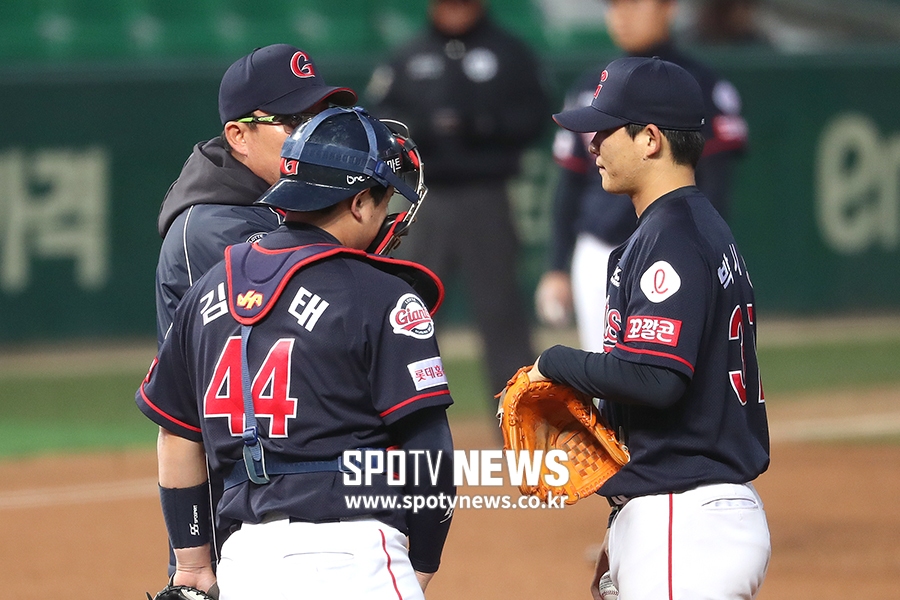 [스포티비뉴스=인천, 곽혜미 기자] 2019 신한은행 MY CAR KBO리그 SK 와이번스와 롯데 자이언츠의 경기가 3일 오후 인천 SK행복드림구장에서 열렸다. 2회말 1사 1,2루 상황에서 롯데 선발 박시영이 코치와 상의를 하고 있다.