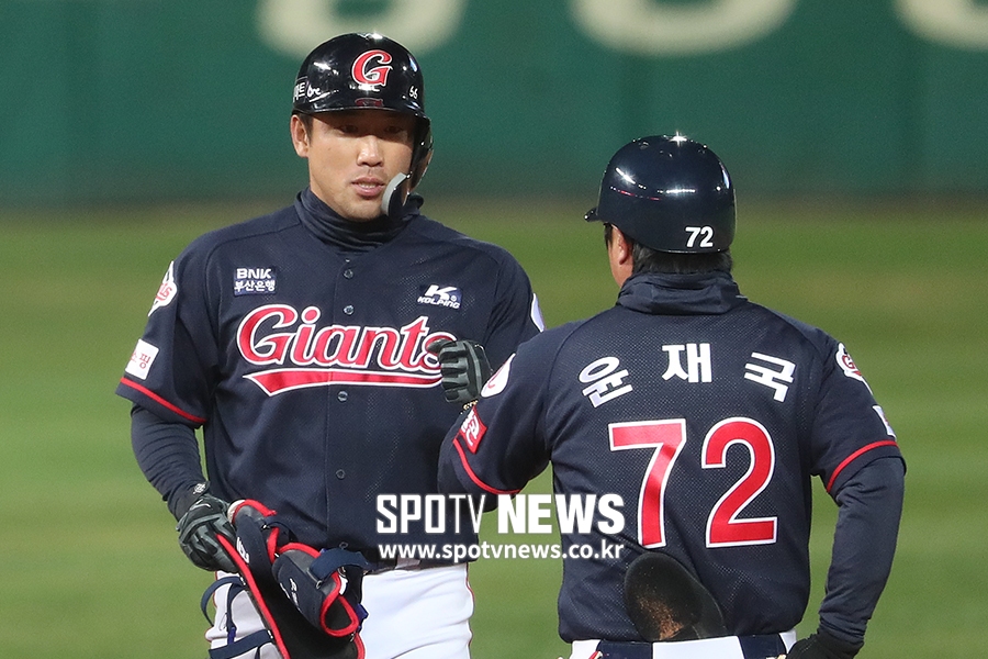 [스포티비뉴스=인천, 곽혜미 기자] 2019 신한은행 MY CAR KBO리그 SK 와이번스와 롯데 자이언츠의 경기가 3일 오후 인천 SK행복드림구장에서 열렸다. 4회초 선두타자로 나선 롯데 전준우가 2루타를 치고 코치와 기쁨을 나누고 있다.
