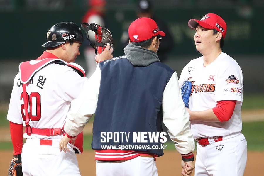 [스포티비뉴스=인천, 곽혜미 기자] 2019 신한은행 MY CAR KBO리그 SK 와이번스와 롯데 자이언츠의 경기가 3일 오후 인천 SK행복드림구장에서 열렸다. 6회초 2사 만루 상황에서 SK 선발 문승원이 코치와 대화를 나누고 있다.