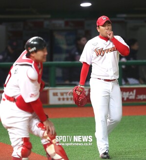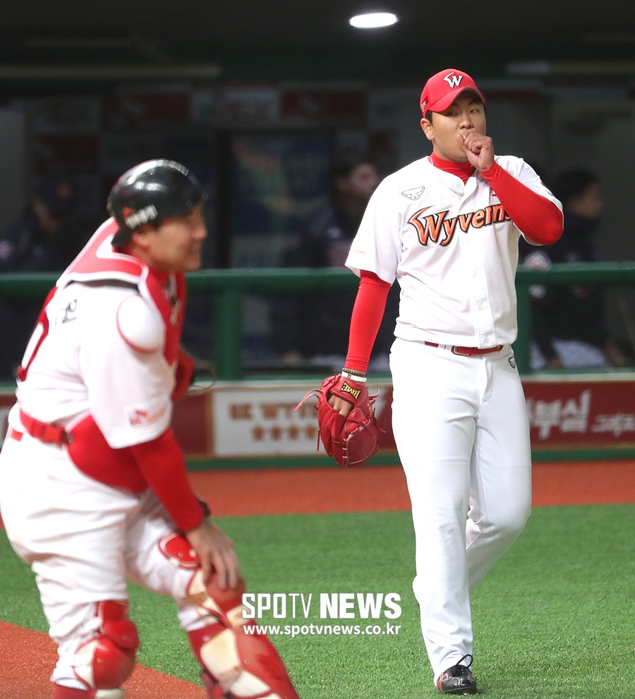 [스포티비뉴스=인천, 곽혜미 기자] 2019 신한은행 MY CAR KBO리그 SK 와이번스와 롯데 자이언츠의 경기가 3일 오후 인천 SK행복드림구장에서 열렸다. 7회초 2사 1,3루 상황에서 롯데 전준우에게 적시타를 허용한 SK 김택형이 아쉬워하고 있다.