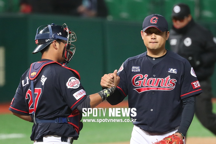[스포티비뉴스=인천, 곽혜미 기자] 2019 신한은행 MY CAR KBO리그 SK 와이번스와 롯데 자이언츠의 경기가 3일 오후 인천 SK행복드림구장에서 열렸다. 3-1로 승리한 롯데 손승락과 나종덕이 하이파이브를 하고 있다.
