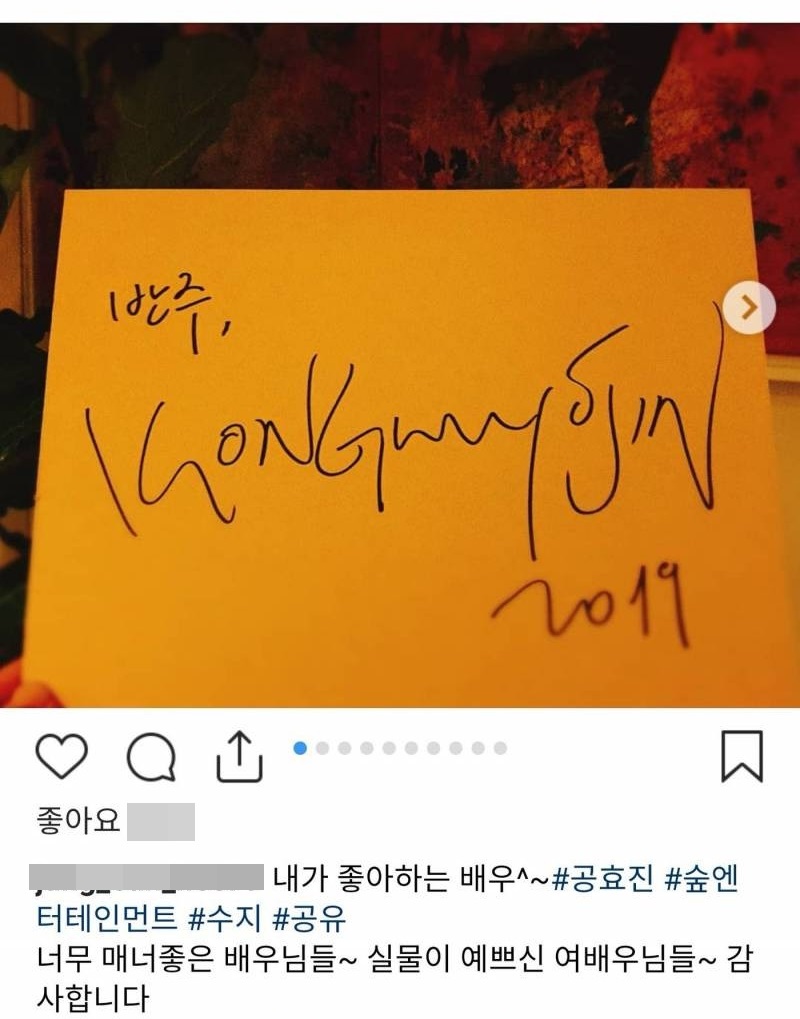 3일 한 누리꾼의 인스타그램에 수지, 공유, 공효진의 친필 사인 사진이 게재됐다. 누리꾼은 “매너 좋은 배우님들~ 실물이 예쁘신 여배우님들~ 감사합니다”라는 글과 더불어 서울 강남 소재의 음식점 이름을 해시태그 했다.