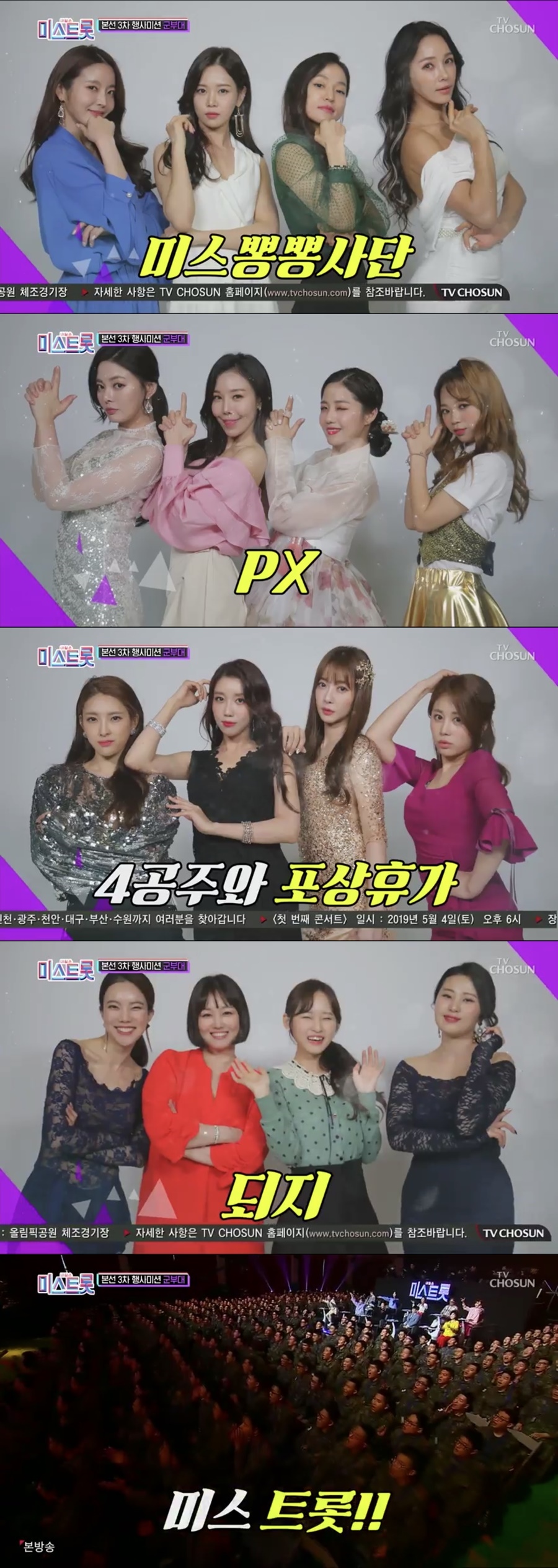 마침내 홍자-지원이-박성연-강예슬의 ‘미스 뽕뽕 사단’, 한가빈-정다경-한담희-우현정의 ‘PX’, 숙행-송가인-하유비-김희진의 ‘트롯여친’, 두리-공소원-김소유-장하온의 ‘4공주와 포상휴가’, 김나희-정미애-이승연-마정미의 ‘되지’가 결성됐다. 곧이어 열광하는 군 장병 500인이 가득 찬 홀에서 숙행-송가인-하유비-김희진의 화려한 무대가 시작되면서, 또 다른 반전과 역대급 트로트로 가득 찰 ‘3라운드 미션’에 대한 기대감을 증폭시켰다.