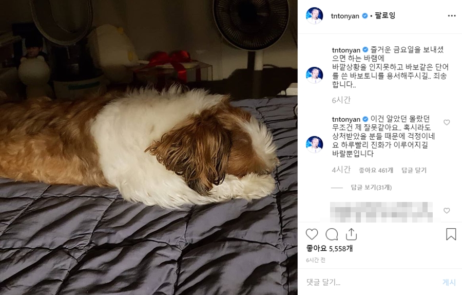 이에 토니안은 해당 게시물을 삭제하고 "즐거운 금요일을 보내셨으면 하는 바람에 바깥 상황을 인지못하고 바보 같은 단어를 쓴 바보 토니를 용서해주시길. 죄송하다"라며 사과했다.